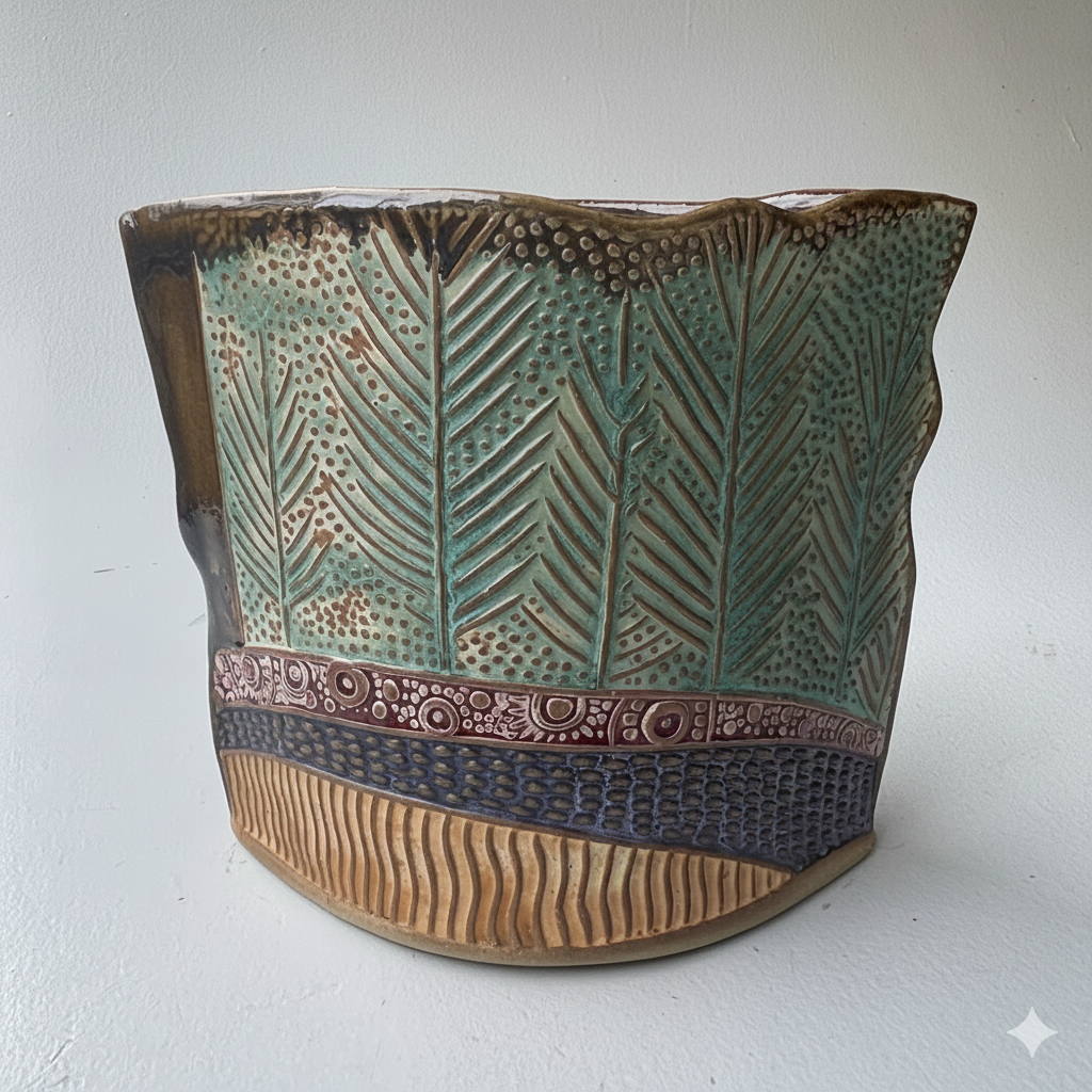 Flower Landscape Pottery Utensil holder or Flower Vase Hand Made Microwave and Dishwasher Safe